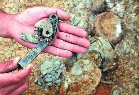 記者還在現(xiàn)場看到一個銅質(zhì)弩機殘件。周科華告訴記者,弩機是射箭的工具,為戰(zhàn)國晚期器物,可能是目前發(fā)現(xiàn)的最早的銅質(zhì)弩機,考古價值極大。另外,還有鐵劍、鐵斧、蒜頭壺、陶罐、陶俑等也較有特色。