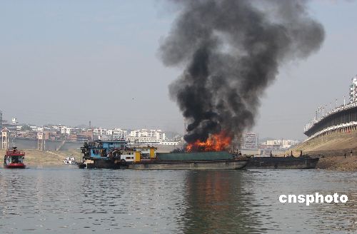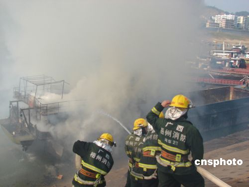 1月3日13時(shí)20分許,廣西梧州桂江上一艘貨船突然起火。由于火勢(shì)大,貨船噴出的火苗很快點(diǎn)燃?吭谂赃叺牧硪凰邑涊,并危及鄰近10多艘貨輪。梧州消防支隊(duì)調(diào)集水上中隊(duì)和河?xùn)|中隊(duì)官兵奮戰(zhàn)近50分鐘,終于將大火撲滅,事故中無人員傷亡。據(jù)了解,當(dāng)時(shí)起火貨船靠岸后船主上岸辦事,不料隨后船艙起火。中新社發(fā) 何永崇 攝