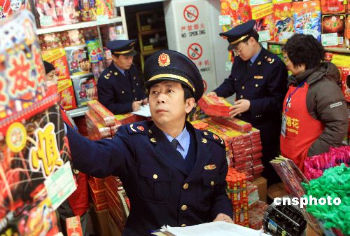 一月十九日,是北京2009年春節(jié)銷售煙花爆竹的首日,為保障市民安全歡度新春佳節(jié),西城工商執(zhí)法檢查人員對(duì)首日開(kāi)始銷售的市場(chǎng)進(jìn)行檢查。中新社發(fā) 任海霞 攝