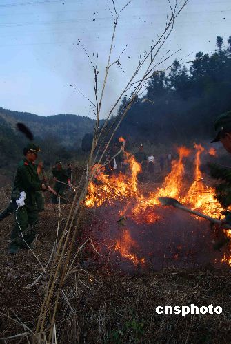 1月20日,武警福建總隊三明支隊官兵在奮力撲火。當(dāng)日下午16時左右,福建三明市梅列區(qū)洋溪鄉(xiāng)羊口仔村后山由于村民野外用火不慎引起山林大火。駐在附近的武警三明支隊100多官兵經(jīng)過1個多小時的奮力撲救,終將山火撲滅。中新社發(fā) 盧立杰 攝