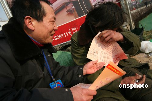 1月22日,許昌市救助管理站的工作人員在救助一個生活無著人員。春節(jié)即將到來,為更好地向困難群體獻愛心、送溫暖,不讓一個生活無著人員流落街頭,當日,河南省許昌市救助管理站開展“迎新春社會關(guān)愛生活無著人員”活動,對符合救助條件的求助者,無償提供食宿、幫助聯(lián)系親屬等。這次活動除與各區(qū)縣救助站同時開展宣傳、咨詢活動外,還會派流動小分隊走上街頭,對生活無著人員進行勸導(dǎo),實施現(xiàn)場救助。中新社發(fā) 牛書培 攝