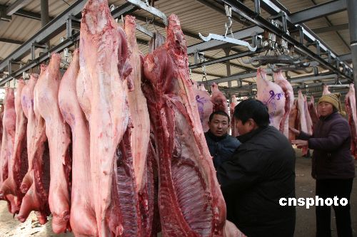 1月22日下午,河南省開封市南郊一生豬定點(diǎn)屠宰廠里人們正在批發(fā)豬肉。春節(jié)將至,開封市豬肉市場(chǎng)生意日益紅火。有關(guān)部門加大市場(chǎng)監(jiān)管力度,堅(jiān)決杜絕經(jīng)營私屠濫宰肉、注水肉、超期變質(zhì)肉、假冒品牌肉、缺少證照等違法現(xiàn)象,讓人民群眾吃上“放心肉”。中新社發(fā) 凱楓 攝