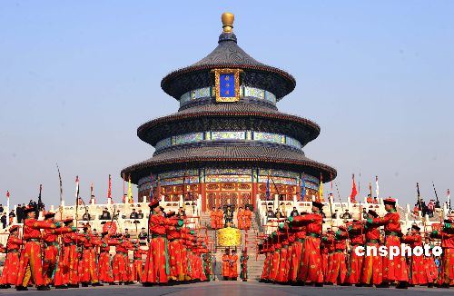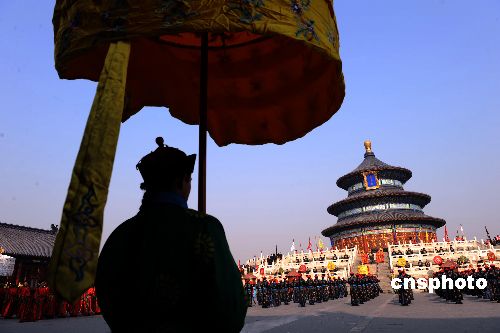 1月28日,北京天壇的祭天盛典。北京天壇公園從農(nóng)歷大年初一至初五推出祭天樂(lè)舞和儀仗展演。演出陣容包括祭天樂(lè)舞239人和祭天儀仗280人,演出現(xiàn)場(chǎng)和周邊主要道路有五彩龍旗、云旗、刀旗等1500面,懸掛燈籠1000只,吸引大批中外游客前往觀禮。中新社發(fā) 廖攀 攝