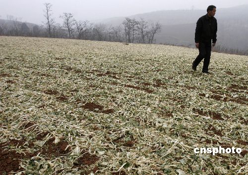 2月2日,河南省洛陽市宜陽縣趙堡鄉(xiāng)農(nóng)民看著滿地干旱蔫黃的油菜,十分無奈。2月2日凌晨,當(dāng)?shù)貧庀蟛块T實(shí)施了多批次人工增雨雪作業(yè),作業(yè)區(qū)內(nèi)普降小雨,一定程度上緩解了當(dāng)?shù)厣只痣U等級,但因為雨量過小,基本于旱情無補(bǔ)。 目前,河南省遭遇1951年以來的特大旱情,全省受旱面積已經(jīng)達(dá)到了63.1%,其中包括洛陽在內(nèi)的豫西地區(qū)尤為嚴(yán)重。河南省氣象局1月29日15時發(fā)布干旱紅色預(yù)警,預(yù)計未來一周內(nèi)河南大部分地區(qū)干旱仍將持續(xù)。 中新社發(fā) 張曉理 攝