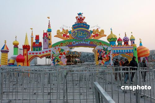 2月3日,北京奧運(yùn)中心區(qū)環(huán)球嘉年華的各項準(zhǔn)備工作正在加緊進(jìn)行中。距離鳥巢僅200米的“環(huán)球嘉年華”項目面臨著嚴(yán)格的審批,由于手續(xù)尚未辦妥,原定于正月初五的開放時間被延遲至月底。環(huán)球嘉年華是奧林匹克公園公共區(qū)的首個大型室外娛樂項目,占地5萬平方米,設(shè)有近百個游樂項目。中新社發(fā) 鄭雄增 攝