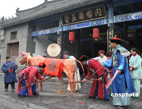2月4日是立春節(jié)氣,在河南內鄉(xiāng)縣衙,身著清代服裝的工作人員,在表演“打春!惫(jié)目。中新社發(fā) 張中立 攝