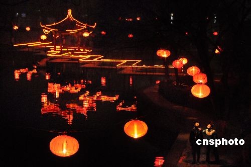 2月7日晚在山東省棗莊市山亭區(qū)太清湖公園內(nèi)拍攝的元宵燈海。連日來,山東省棗莊市山亭區(qū)太清湖公園內(nèi)張燈結彩,喜迎元宵佳節(jié)。夜幕下的湖中倒影璀璨繽紛,整個公園仿佛燈的海洋。中新社發(fā) 李宗憲 攝