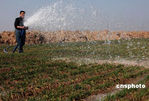2009年2月10日,安徽淮北市濉溪縣韓村鎮(zhèn)韓村的農(nóng)民在抽水澆灌麥苗。2月8日晚間~2月9日清晨,安徽省淮北市部分地區(qū)迎來(lái)了一場(chǎng)難得的小雨,但此次降水過(guò)程由于持續(xù)時(shí)間短,且雨量很小,并不能夠緩解目前的旱情。中新社發(fā) 謝正義 攝
