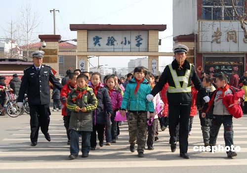 2月10日,交通民警護(hù)送小學(xué)生安全過(guò)馬路。當(dāng)日是山東省棗莊市各中小學(xué)開(kāi)學(xué)首日,棗莊市臺(tái)兒莊區(qū)公安交警大隊(duì)在中小學(xué)門前設(shè)立“護(hù)校崗”,增派警力負(fù)責(zé)指揮疏導(dǎo)學(xué)校門前的交通秩序,護(hù)送上下學(xué)的廣大師生安全過(guò)馬路,保證了轄區(qū)廣大中小學(xué)生高高興興上學(xué),平平安安回家。中新社發(fā) 高啟民 攝