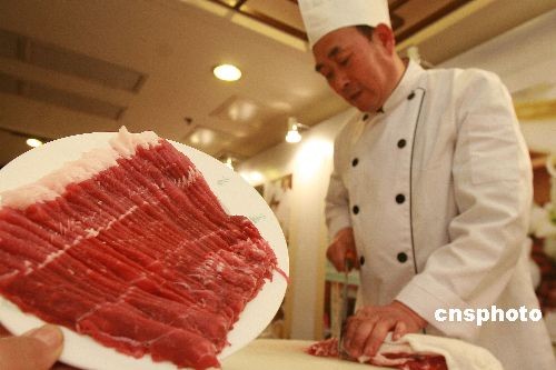 東來順涮羊肉制作技藝傳承人陳立新現(xiàn)場表演切羊肉片,每片羊肉都是0.9毫米。