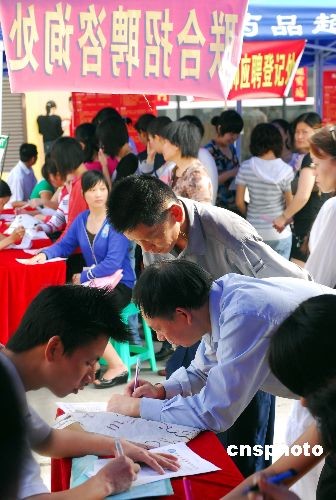 2009年2月16日,海南省就業(yè)局聯(lián)合大型零售企業(yè),在?、三亞、澄邁等全省8個市縣同時舉行針對弱勢群體的大型現(xiàn)場招聘會,專門招收下崗職工、失業(yè)人員、零就業(yè)家庭人員、大中專畢業(yè)待業(yè)青年和農(nóng)民工。用人單位對聘用人員一律進行培訓上崗,無論哪個工種的工資,都不低于所在市縣的最低生活保障金,且到崗就給購買各項保險。中新社發(fā) 善平 攝