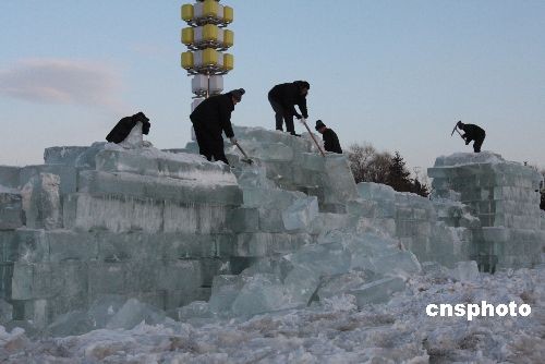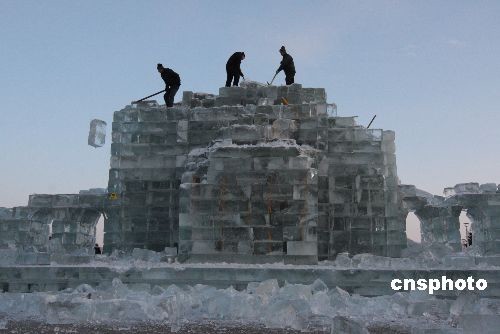 2月28日,施工人員在牡丹江市城區(qū)冰堡旅游景點拆除融化的冰雕作品!傲⒋骸边^后,素有“雪城”之稱的黑龍江省牡丹江市氣溫回升較快,城區(qū)內(nèi)的各大冰雪旅游景點的冰雪作品開始融化,失去寒冬里的風采。從當日起,城區(qū)冰雪旅游景點管理部門對融化的冰雕作品進行拆除。中新社發(fā) 莊文斌 攝