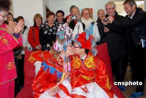 3月1日,江蘇鎮(zhèn)江市永安新城小區(qū)的喬樑迎娶比利時姑娘多娜。據(jù)了解,喬樑是在留學(xué)比利時期間與校友多娜相識、相戀、相愛走到了一起,兩人商議在中國舉行婚禮的想法得到雙方父母支持,多娜的20多位親友也從比利時隨行來中國參加了婚禮活動。中新社發(fā) 陳崗 攝