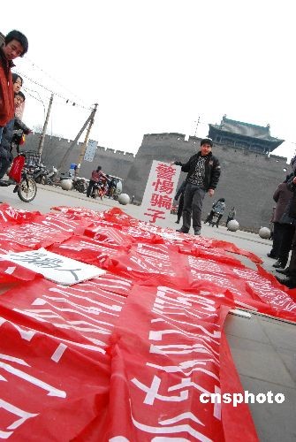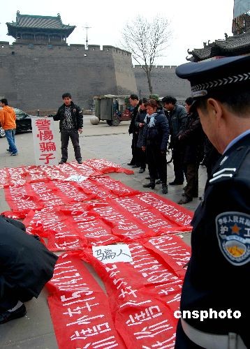 2009年3月1日,山西平遙古城,一小伙兒手持“警惕騙子”木牌,展示收繳的“低價售小車”廣告條幅在街頭展示。據(jù)了解,該小伙姓王,幾天前看了懸掛在墻頭的條幅廣告購買二手私家車,不想錢匯了,車卻沒有到手。為了不讓其他人再上當受騙,他上街四處清理這些騙人的條幅廣告,并在街頭公然向騙子宣戰(zhàn):“騙子掛一幅,我就撕一幅,決不能讓它再騙人!敝行律绨l(fā) 梁寶海 攝