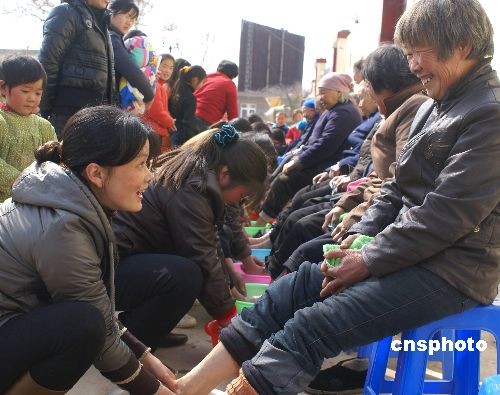 3月7日,河南省濟(jì)源市王屋鎮(zhèn)愚公村的媳婦們在為婆婆洗腳。 為迎接“三八”婦女節(jié),濟(jì)源市王屋鎮(zhèn)愚公村組織村里的媳婦為婆婆洗腳,從而提倡孝道,增進(jìn)婆媳感情,促進(jìn)農(nóng)村和諧社會建設(shè)。中新社發(fā) 平白 攝