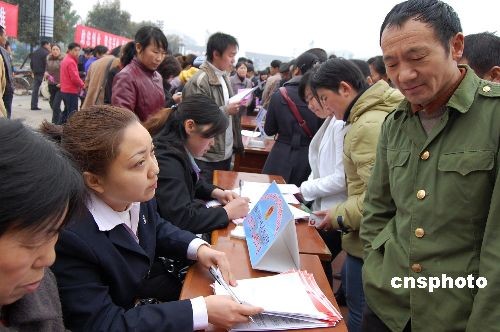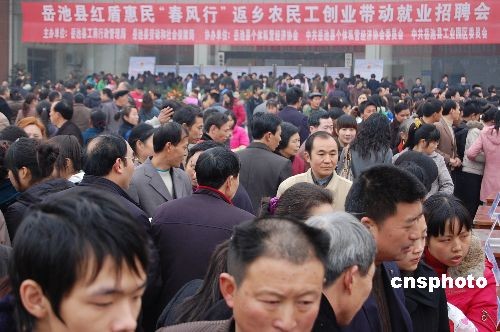 為解決農(nóng)民工就業(yè)難的問題,3月9日,四川岳池舉辦“紅盾惠民春風(fēng)行”返鄉(xiāng)農(nóng)民工創(chuàng)業(yè)帶動(dòng)就業(yè)招聘會(huì),上萬(wàn)名農(nóng)民工前往應(yīng)聘。共有41個(gè)單位參與招聘,提供就業(yè)崗位3400余個(gè)。中新社發(fā) 胡佐斌 攝