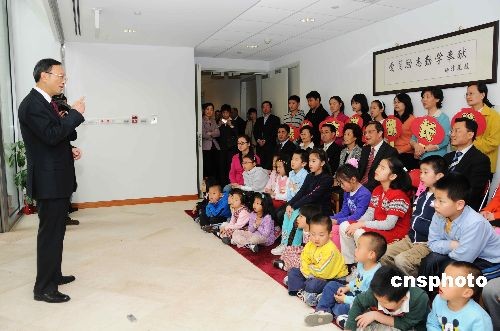 當?shù)貢r間三月十二日,正在美國訪問的中國外交部部長楊潔篪來到中國駐美大使館視察中國250多家駐外使領館中的一所學!v美使館陽光學校。楊潔篪在和學校孩子們交談時鼓勵他們學說中國話,學寫中國字,學做中國人,并為陽光學校題寫校訓:“愛國勵志勤學奉獻”。圖為楊潔篪在和陽光學校老師和孩子們交流中。 中新社發(fā) 邱江波 攝