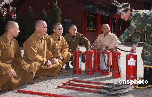 2009年3月17日,山西省盂縣永清寺院內(nèi),消防戰(zhàn)士在向僧人講解滅火器的正確使用方法。當(dāng)日,盂縣消防大隊(duì)開展“消防安全進(jìn)寺廟”活動(dòng),消防戰(zhàn)士深入寺廟,手把手教僧人使用消防器材,現(xiàn)場(chǎng)培訓(xùn)僧人在火災(zāi)發(fā)生后第一時(shí)間內(nèi)協(xié)助消防員進(jìn)行救援、緊急疏散的技能。中新社發(fā) 程瑜 攝
