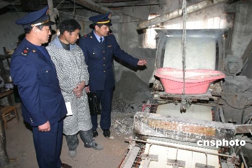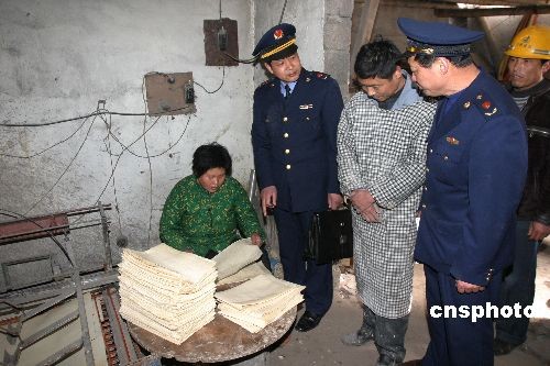 3月19日,江蘇連云港墟溝工商所在連云區(qū)城鄉(xiāng)結(jié)合部簡明平房查處一無證煎餅黑作坊。執(zhí)法人員現(xiàn)場發(fā)現(xiàn),原料庫內(nèi)堆放著做煎餅的原料,原料包裝物上沒有任何標志,無合格證。加工間狹小、設(shè)備簡陋,隱蔽在簡易破舊的平房內(nèi),做飯、加工于一體。場所內(nèi)兩口盛面糊的大缸周圍污穢不堪,污水遍地,衛(wèi)生狀況十分惡劣。煎餅主要送往城區(qū)市場、學校周邊及工業(yè)區(qū)外來人員上班經(jīng)過的地方銷售。執(zhí)法人員當即責令煎餅作坊停止生產(chǎn),并對加工機器予以查封。中新社發(fā) 王健民 攝