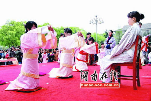 漢民族的女子成人禮又稱“笄禮”。3名少女在司儀的指引下,先在銅盆中凈手,再將長發(fā)梳發(fā)髻插入發(fā)簪,隨后起身加上一件外衣,向親人行叩拜大禮,再喝完禮酒,同樣的步驟重復(fù)3遍才算結(jié)束,歷時(shí)1個(gè)小時(shí)。