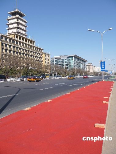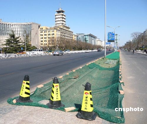 2009年4月1日,北京長(zhǎng)安街復(fù)興門南側(cè)路段機(jī)動(dòng)車道和非機(jī)動(dòng)車道之間的綠化帶已拆除,為了防止揚(yáng)塵現(xiàn)象的產(chǎn)生,原綠化帶的地面上全都鋪設(shè)了各色遮擋物。民族文化宮南側(cè)的施工人員正在加緊遷移路邊的樹木,這些都標(biāo)志著長(zhǎng)安街拓寬工程開始進(jìn)入實(shí)施性進(jìn)展階段。 中新社發(fā) 玉龍 攝