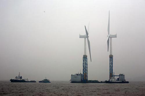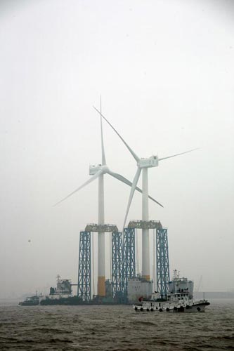 人民網(wǎng)上海4月5日電 昨晚,國(guó)家海上風(fēng)電示范項(xiàng)目、上海市重大工程——東海大橋100兆瓦海上風(fēng)電場(chǎng)的第二、第三臺(tái)風(fēng)機(jī),在上海洋山港海事處的護(hù)航和監(jiān)控下,經(jīng)過(guò)38海里的海上航行,被一次性運(yùn)抵吊裝作業(yè)地點(diǎn)。