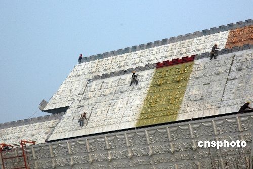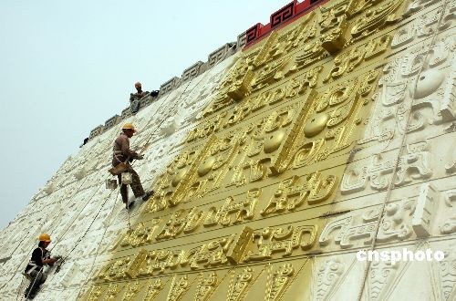 4月5日,河南省安陽市中國文字博物館建設(shè)現(xiàn)場,建設(shè)者們在進行施工。中國文字博物館自2007年在安陽市正式開工建設(shè)以來,各項建設(shè)工作正在有條不紊地向前推進,2009年底有望開館。據(jù)悉,建成后的中國文字博物館由字坊、廣場、主體館、倉頡館、科普館、研究中心、交流中心等建筑組成,將是世界上第一家以文字為主題的國家級專業(yè)博物館。中新社發(fā) 常中正 攝