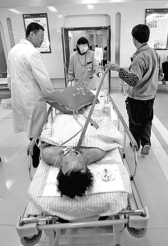 這樣的場(chǎng)面讓所有看到的人心里都發(fā)毛了。昨天(4月6日)中午,浙醫(yī)二院(浙江)的救護(hù)車(chē)上抬下一位傷員,被醫(yī)護(hù)人員快速送進(jìn)了急救室。圍觀的人發(fā)現(xiàn),傷員的嘴里插著一根長(zhǎng)長(zhǎng)的鋼筋,嘴邊全是血,人似乎已經(jīng)沒(méi)了知覺(jué),邊上一位工友神色凝重,小心地扶著鋼筋,焦急地喊著,“鋼筋戳到了嘴里,快讓讓?zhuān)热税。?