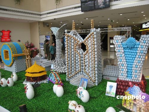 4月11日,沈陽一購物中心內(nèi)展示出了特殊的沈陽城市地標(biāo)建筑群,整個(gè)建筑群占地24平方米,高1.8米,用3萬5千個(gè)復(fù)活節(jié)彩蛋搭建而成。這座地標(biāo)群是必勝客聯(lián)合沈陽建筑大學(xué)百名師生共同制作完成的,包括沈陽故宮大政殿、房地產(chǎn)大廈、方圓大廈、二十一世紀(jì)大廈、百合塔等建筑。中新社發(fā) 沈殿成 攝