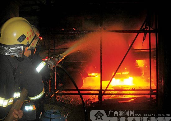 4月16日晚8時許,在南寧市仙葫開發(fā)區(qū)東方外國語學(xué)院的工地上,一輛灌漿車不明起火,引燃了油箱。經(jīng)消防隊員一個多小時的撲救,大火在當(dāng)晚9時30分才被完全撲滅。