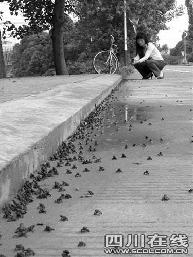 昨日,在豐樂(lè)水庫(kù)邊生活已30年的居民萬(wàn)女士說(shuō),她發(fā)現(xiàn)有小蟾蜍從水庫(kù)里跳上岸是在一周前,當(dāng)時(shí)數(shù)量較少,很多人都沒(méi)留意。昨日一早,眼前景象讓她和鄰居們大吃一驚:原先“單兵”上岸的小蟾蜍此時(shí)已成“集團(tuán)軍”,公路上、道路邊、庫(kù)堤上、緊鄰水庫(kù)邊的居民樓房墻壁上,到處都爬滿了小蟾蜍,努力地朝同一個(gè)方向跳去。