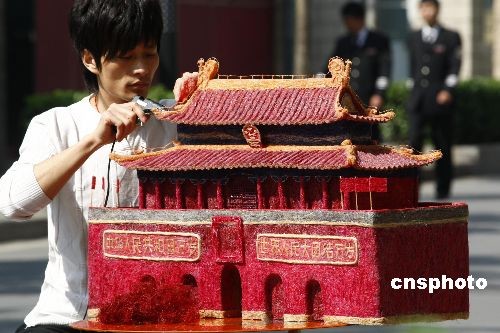 為迎接60周年大慶,北京一位發(fā)型設(shè)計(jì)師用碎頭發(fā)制作了一個(gè)微型“天安門”,總共用了11公斤長(zhǎng)短不一的碎頭發(fā),歷時(shí)5個(gè)多月才完工。這位來(lái)自四川的青年理發(fā)師,此前還為奧運(yùn)獻(xiàn)上了頭發(fā)絲作的“鳥巢”、“水立方”、“福娃”等,并贏得了國(guó)內(nèi)外游客的好評(píng)。中新社發(fā) 鄭雄增 攝