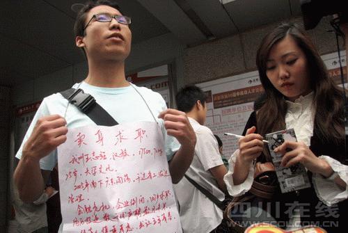 想找份好工作,就要學會推銷自己。昨(26)日上午,成都市人才市場門口出現(xiàn)了讓人目瞪口呆的一幕:一名25歲的小伙子身掛“求職”招牌,尋求一份年薪10萬元的工作。如此推銷自己,他也坦然承認:我就是在包裝自己而已。