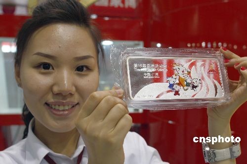 4月28日,在北京工美商場(chǎng)里,工作人員正在展示“第16屆亞洲運(yùn)動(dòng)會(huì)吉祥物紀(jì)念銀條”。據(jù)了解,由廣州2010亞洲運(yùn)動(dòng)會(huì)組委會(huì)授權(quán)發(fā)行的《第16屆亞洲運(yùn)動(dòng)會(huì)吉祥物紀(jì)念金銀條》上市以來(lái)一直受到廣大市民的青睞。金銀條以正面吉祥物五羊(阿和、阿祥、阿如、阿意、樂(lè)羊羊)和會(huì)徽中火焰局部造型為元素。中新社發(fā) 鄭雄增 攝