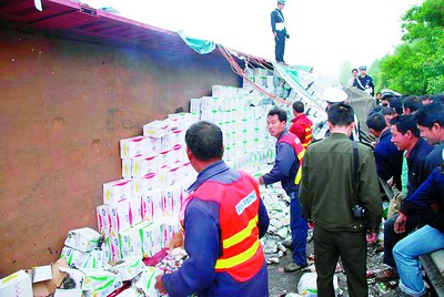 昨日(2日)上午8時,京珠高速臨長段由北往南方向125公里處,一輛裝滿牛奶的大貨車發(fā)生側(cè)翻,5000件牛奶傾覆一地。高速交警臨長大隊水渡河中隊接警后出動三個巡邏組,10余名民警趕赴現(xiàn)場維持秩序。