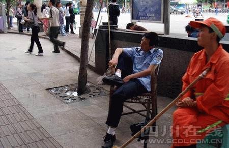 昨日(5日),照片里的主角,宜賓市(四川)翠屏區(qū)市容管理局南城中隊協(xié)管員李劍勇表示,單位領導已批評教育他了,自己影響了宜賓和宜賓城管的形象,他表示非常抱歉!爱敃r所有的攤點都已規(guī)范位置了,想坐著休息下!崩顒τ抡f,城管協(xié)管員沒有固定工作點,他便在游攤最易出現(xiàn)的南門橋頭坐著休息會兒,他希望所有的城管隊員都將他作為反面教材,在以后的工作中注意紀律和形象。