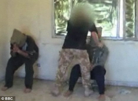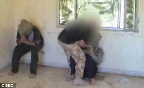 這段長約一分鐘的錄像顯示,6名伊拉克男子被帶著頭套,在大聲呼號(hào)。他們被迫將手伸展著,手腕被手銬銬起來,腿保持彎曲,不許蹲、不許坐,姿態(tài)看起來非常痛苦。一名英國士兵正在尖叫著大罵他們?yōu)椤霸撍赖脑澈铩薄?