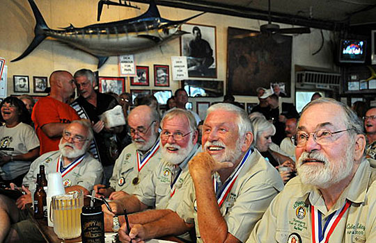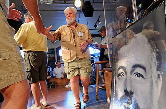 7月23日,“山寨”海明威大賽在在美國(guó)佛羅里達(dá)州海島小城基韋斯特的“邋遢喬”酒吧舉行。今年7月21日是海明威誕辰110周年紀(jì)念日。每年這個(gè)日子前后,海明威上世紀(jì)30年代曾居住過的佛羅里達(dá)州基韋斯特都會(huì)舉辦名為“海明威日”的系列紀(jì)念活動(dòng)。其中最著名的就是在“邋遢喬”酒吧舉行的海明威模仿大賽,評(píng)選模仿海明威衣著、神態(tài)最像的人。