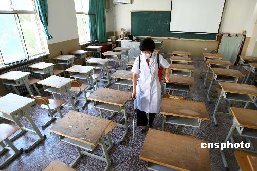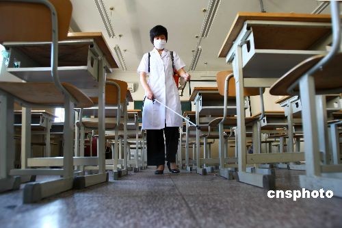 6月22日周一,北京市海淀區(qū)二里溝中心小學(xué)的老師在同學(xué)到來之前為校室進(jìn)行全面的消毒,嚴(yán)防甲型H1N1。近日,針對(duì)甲型H1N1流感警戒級(jí)別升至6級(jí),北京市衛(wèi)生局、教委聯(lián)合印發(fā)《北京市學(xué)校傳染病防控工作管理指導(dǎo)意見》,北京市各學(xué)校須每周至少對(duì)教室、走廊等處所消毒一次,在特殊時(shí)期要每日消毒。中新社發(fā) 富田 攝