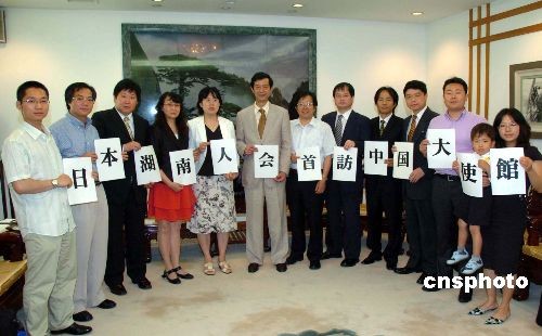 中國駐日大使館許澤友參贊兼總領事,7月2日下午在大使館會見了日本湖南之友會共同代表、日本湖南人會會長段躍中一行,并和日本湖南人會的副會長、理事們進行了一個小時的座談。許澤友說,湖南有很深的文化底蘊,又有豐富的資源,發(fā)展?jié)摿艽蟆F诖谌蘸先藶榇龠M家鄉(xiāng)、祖國與日本的交流方面起橋梁和窗口的作用。圖為日本湖南人會理事和許澤友總領事(左六)、劉敬師領事(右四)合影。中新社發(fā) 段躍中 攝