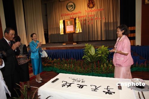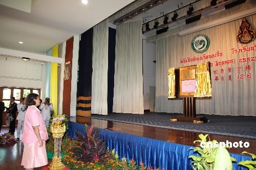 六月十二日的泰國吉拉達學校古老校園里洋溢著濃郁的中國文化氣息。在喧天的鑼鼓聲中,泰國瑪哈扎克里·詩琳通公主殿下按動電鈕,寫有“吉拉達學?鬃诱n堂”的牌匾徐徐拉開帷幕,標志著泰國第七家孔子課堂正式落戶這個坐落于泰國王宮里的學校。揭牌儀式上,詩琳通公主還興致勃勃地重酌墨水,揮毫為孔子課堂題寫了“學無止境 ”四個漢字,并勉勵泰國各孔子學院、孔子課堂擔當起推動泰國漢語教學進步、促進中泰友好關(guān)系發(fā)展的重任。中新社發(fā) 顧時宏 攝
