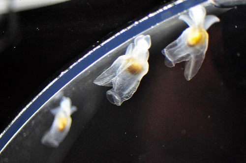 據(jù)了解,這種海洋浮游生物學名叫做Clione limacina),通常生活在南極、北極的寒冷海域。由于其喜好寒冷且身體晶瑩透明,于是便有了“冰海小精靈”的美稱。有部分該生物生活在日本最寒冷的北海道地區(qū),被當?shù)厝艘暈榧榈南笳,稱為“流水天使”。另外,相似的浮游生物物種也有生活在溫熱水域的情況,而這次捕獲“小精靈”,屬于日本北海道“流水天使”的近親。這種生物體型最大不過3公分,通常生活在離岸水域,人們對它的生活習性至今不是十分清楚。