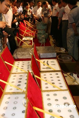 7月14日上午,河南省文物局和安陽市在河南博物院多功能廳舉行河南省征調文物入藏儀式,將河南博物院和河南省文物考古研究所收藏的193件有關文字的文物移交中國文字博物館收藏。這批移交的文物包括河南博物院藏“十六年鄭令”戈、銅“部曲將”印、曾子甗等123件文物和河南省文物考古研究所藏的賈湖龜腹甲刻符、新蔡葛陵楚墓竹簡、溫縣盟書、長子口鼎、、薳子昃鼎、平夜君成戈、垂球等不同歷史時期的各門類文物70件。中新社發(fā) 王中舉 攝