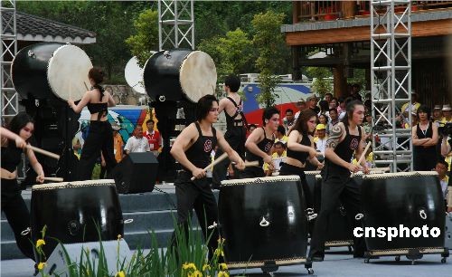 5月14日,韓國(guó)黑鼓樂(lè)隊(duì)在當(dāng)日開(kāi)幕的“二00九中國(guó)張家界國(guó)際鄉(xiāng)村音樂(lè)周”上表演。黑鼓樂(lè)隊(duì)曾多次應(yīng)邀來(lái)中國(guó)演出,曾參加了“2008北京奧林匹克文化活動(dòng)”公演。參加此次音樂(lè)周的還有來(lái)自美國(guó)、菲律賓、澳大利亞等國(guó)的二十多支樂(lè)隊(duì)和境內(nèi)的七支民族樂(lè)隊(duì)。中新社發(fā) 劉雙雙 攝