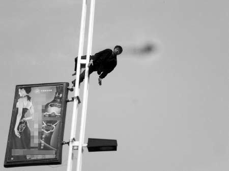 5月16日14時45分,許昌市(河南)消防支隊(duì)禹州大隊(duì)接到報警,位于禹州市濱河路東段歐蔓咖啡廳對面一路燈桿上有人要自殺。消防官兵趕到現(xiàn)場發(fā)現(xiàn),一名約40歲左右,操外地口音的男子在路燈桿頂部,一會兒躺在路燈桿頂部的燈罩架上做出睡覺姿勢,一會兒抓住燈罩架蕩起“秋千”。