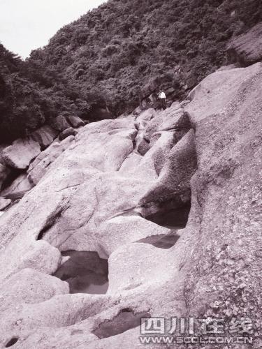 專(zhuān)家推測(cè),冰川運(yùn)動(dòng)在這里形成了一個(gè)很大的冰床,冰水滴水穿石,形成一個(gè)個(gè)圓圓的冰臼。 (張發(fā)政 高志農(nóng))