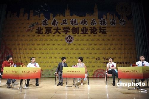 6月2日,北京大學(xué)創(chuàng)業(yè)論壇在北京大學(xué)舉辦,皇明太陽(yáng)能董事長(zhǎng)黃鳴、七匹狼董事長(zhǎng)周少雄、福建汽車工業(yè)協(xié)會(huì)會(huì)長(zhǎng)凌玉章、3G門(mén)戶網(wǎng)總裁張向東,與北京大學(xué)的同學(xué)們共享創(chuàng)業(yè)經(jīng)驗(yàn)。該論壇由東南衛(wèi)視和共青團(tuán)北京大學(xué)委員會(huì)共同主辦。中新社發(fā) 廖攀 攝