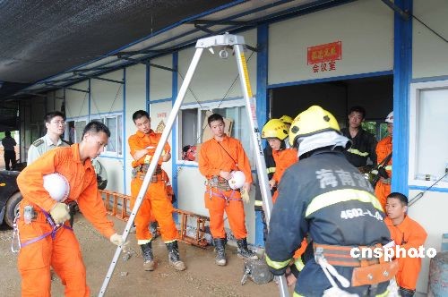 6月4日23時許發(fā)生的三亞繞城高速公路迎賓隧道塌方事故救援工作6日繼續(xù)進行。截止6日上午9點半,8名被困施工人員尚無人員救出。三亞市交通局副局長崔海龍上午介紹說,在原有救援方案繼續(xù)進行的同時,目前新增了兩套救援方案。一是從隧道上方新增一處選址鉆孔到隧道內(nèi),安插一個管道,為被困人員送水、送風、送食物、喊話“送信心”。目前這一方案正在進行中,但進度較慢。二是從塌方處由外向里挖“貓洞”作為救生通道,用鋼板制作一個三角形的通道,能容納一個人進出,通向被困人員。圖為三亞消防官兵在調(diào)試救援設(shè)備。中新社發(fā) 胡劍兵 攝