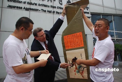 6月13日,飛虎隊(duì)老兵后代葛德納來到位于成都大邑縣的建川博物館,向該館捐贈(zèng)了一批珍貴的抗戰(zhàn)文物。這批文物來自葛德納的父親、配屬新六軍14師的美軍聯(lián)絡(luò)官葛頓南John Gardner少校。圖為葛德納(左二)將新六軍軍長廖耀湘中將贈(zèng)給葛頓南少校的一幅長軸(縱向)原件轉(zhuǎn)交給建川博物館館長樊建川(右一)。中新社發(fā) 吳志維 攝