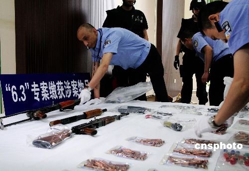 6月15日,重慶市公安局向媒體通報(bào),當(dāng)月3日發(fā)生在重慶主城區(qū)的槍擊案已告破。警方抓獲直接參與持槍殺人的3名罪犯,還通過(guò)偵破此案發(fā)現(xiàn)和擴(kuò)大線索,一舉抓獲50多名涉槍、涉黑和涉惡等犯罪的嫌疑人,繳獲兩支56沖鋒槍、一支唧筒式獵槍、一支德國(guó)造PP手槍、一支仿制手槍和一枚手雷、一副手銬及439發(fā)各類(lèi)子彈。圖為重慶警方在整理繳獲的涉案物品。中新社發(fā) 郭虹 攝